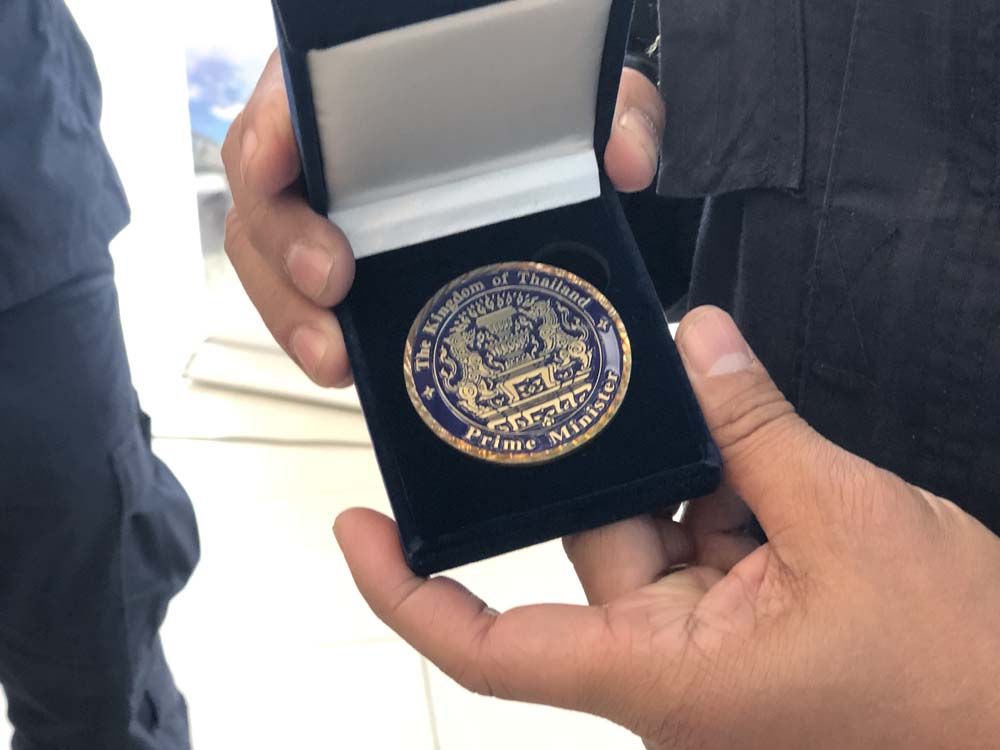 จากนั้นนายกฯถ่ายภาพร่วมกับคณะ และมอบเหรียญที่ระลึกจากนายกฯซึ่งเป็นตราสัญลักษณ์สำนักนายกรัฐมนตรีให้กับทีม USAR Thailand และยังระบุว่า This for you ให้มอบกับสุนัขซาฮาร่าและเซียร่าด้วย พร้อมกล่าวกับสุนัขและลูบหัวอย่างเอ็นดูว่า ขอบใจนะลูกนะ โชคดีนะ อายุยืนยาว ช่วยทำประโยชน์ให้กับประเทศชาติต่อไป