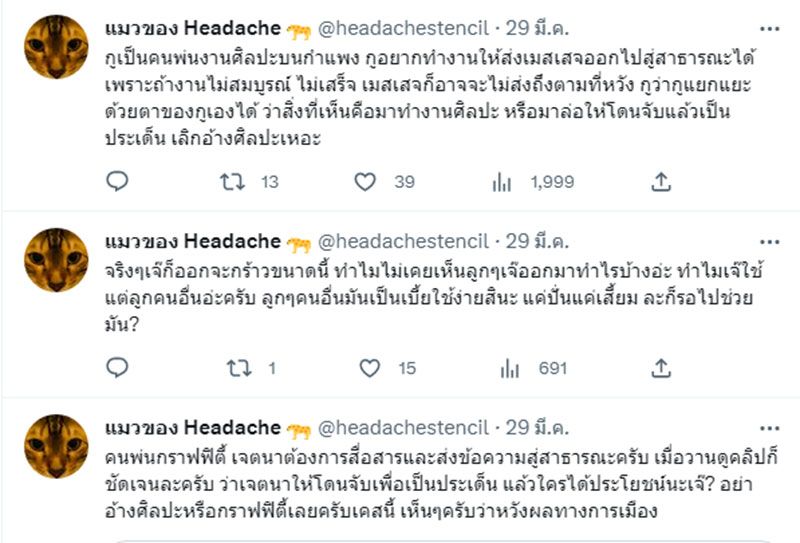 "ตนเป็นคนพ่นงานศิลปะบนกำแพง อยากทำงานให้ส่งเมสเสจออกไปสู่สาธารณะได้ เพราะถ้างานไม่สมบูรณ์ ไม่เสร็จ เมสเสจก็อาจจะไม่ส่งถึงตามที่หวัง ตนคิดว่าแยกแยะด้วยตาของตนเองได้ว่าสิ่งที่เห็นคือ มาทำงานศิลปะ หรือมาล่อให้โดนจับแล้วเป็นประเด็น เลิกอ้างศิลปะเหอะ"
