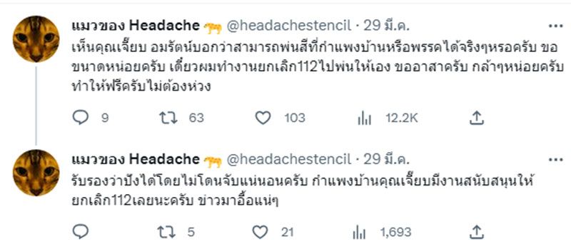 "เห็นคุณเจี๊ยบ อมรัตน์บอกว่าสามารถพ่นสีที่กำแพงบ้านหรือพรรคได้จริงๆหรอครับ ขอขนาดหน่อยครับ เดี๋ยวผมทำงานยกเลิก112ไปพ่นให้เอง ขออาสาครับ กล้าๆหน่อยครับ ทำให้ฟรีครับไม่ต้องห่วง รับรองว่าปังได้โดยไม่โดนจับแน่นอนครับ กำแพงบ้านคุณเจี๊ยบมีงานสนับสนุนให้ยกเลิก 112 เลยนะครับ ข่าวมาอื้อแน่ๆ"แป้ง ศิลปินกราฟฟิตี้ ระบุ