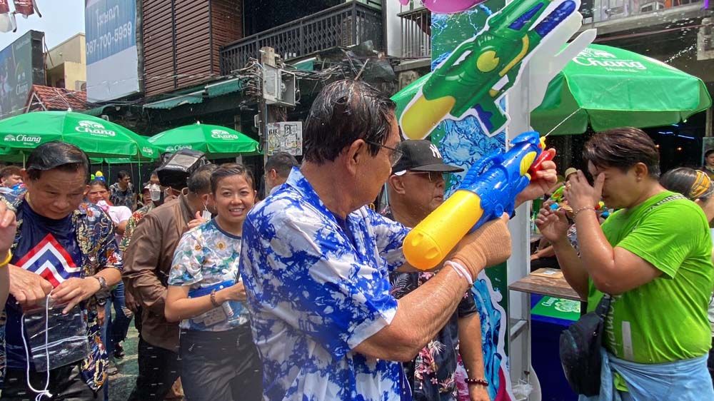 เมื่อพล.อ.ประยุทธ์ เดินไปถึงในส่วนที่มีการเล่นน้ำก็ถูกสาดน้ำใส่อย่างแรง พล.อ.ประยุทธ์ จึงได้ใช้ปืนฉีดน้ำมาเล่นน้ำสงกรานต์กับประชาชนและนักท่องเที่ยวตลอดเส้นทางของถนนข้าวสาร ซึ่งเป็นภาพที่ไม่เคยเห็นมาก่อน โดยมีบางส่วนเล่นน้ำค่อนข้างรุนแรงฉีดน้ำเข้าที่ใบหน้าของพล.อ.ประยุทธ์ เจ้าหน้าที่จึงพยายามเตือนและกันไม่ให้น้ำเข้าบริเวณดวงตาของพล.อ.ประยุทธ์ แต่เจ้าตัวบอกไม่เป็นไรน้ำเย็นชุ่มฉ่ำดี