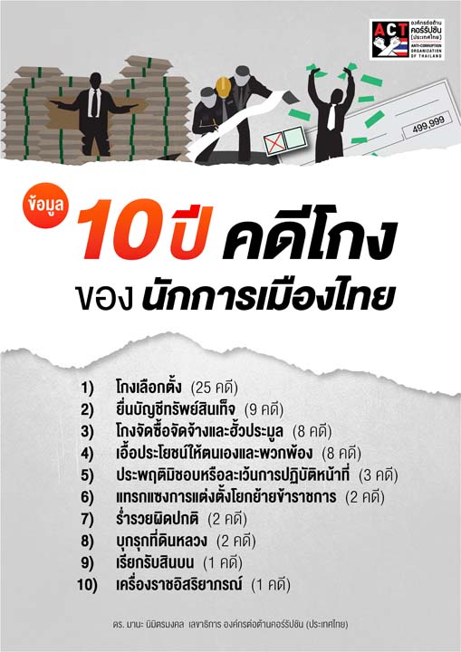 องค์กรต่อต้านคอร์รัปชัน (ประเทศไทย) รวบรวมข้อมูลคดีคอร์รัปชันของนักการเมืองในรอบ 10 ปี พบ 61 คดี และมีนักการเมืองกระทำผิด 68 คนซึ่งมีลักษณะการกระทำความผิด 10 แบบทั้งจากพรรคใหญ่และเล็กทำกันเป็นเครือข่ายร่วมกับข้าราชการประจำแต่น้อยมากที่นักการเมืองจะถูกดำเนินคดี หวังสร้างการตระหนักรู้ให้ประชาชนเจ็บแล้วต้องจำไม่เลือกคนโกงเข้ามาบริหารบ้านเมือง