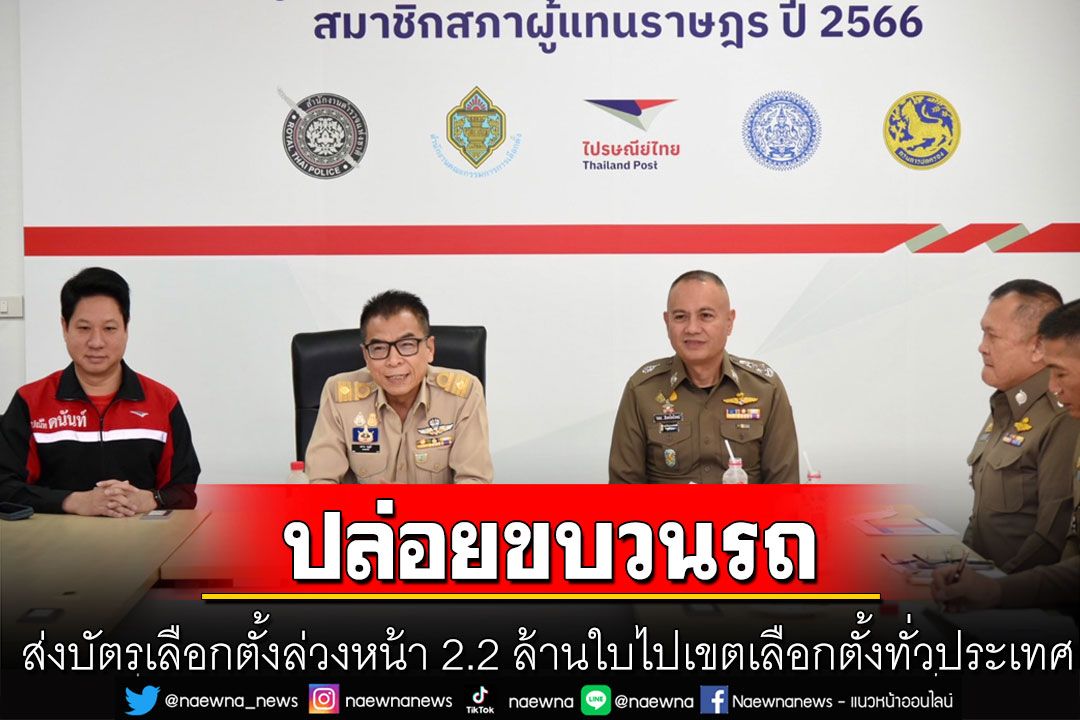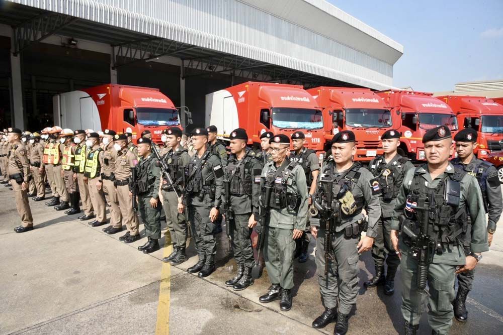 “ตำรวจ” ร่วม กกต. - ไปรษณีย์ไทย ปล่อยขบวนรถขนส่งบัตรเลือกตั้งล่วงหน้า 2.2 ล้านใบ ไปยังเขตเลือกตั้งทั่วประเทศ “ศลต.ตร.” จัดกำลังคุมเข้ม ตชด. ตำรวจท้องที่ ตำรวจทางหลวง 1,356 นาย ดูแลความปลอดภัยคุ้มกันตลอดเส้นทาง