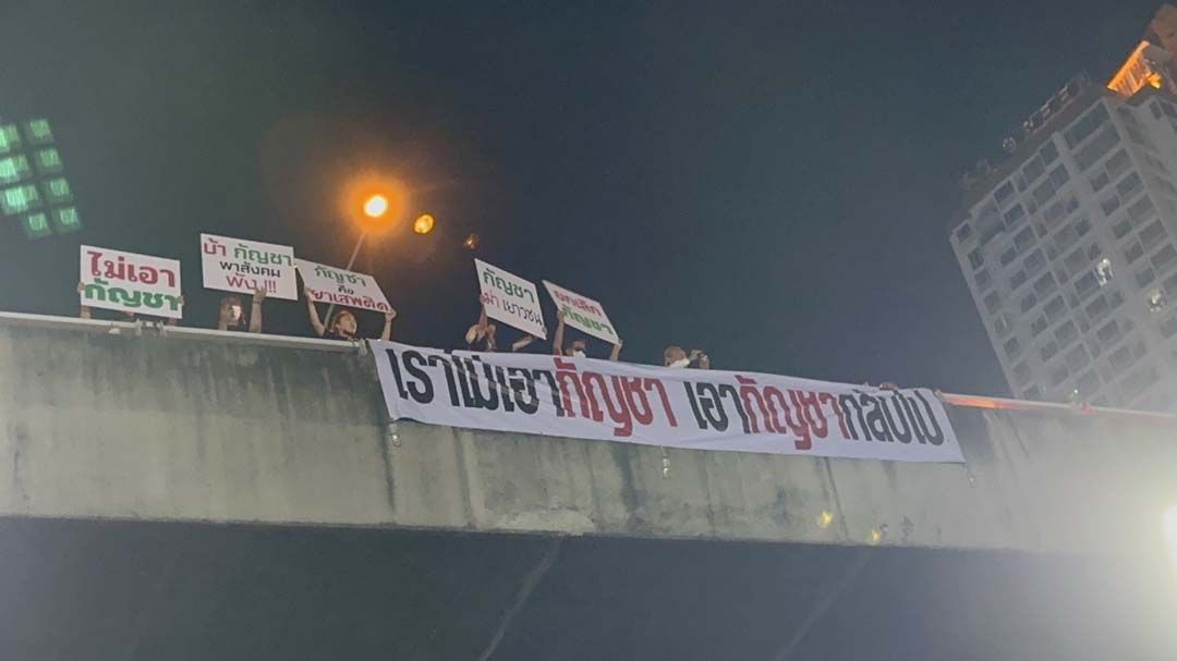 ต่อมา เวลา 19.05 น.ผู้สื่อข่าวรายงานว่า ระหว่างที่นายอนุทิน กำลังปราศรัยอยู่บนเวทีนั้น ปรากฏว่านายชูวิทย์ กมลวิศิษฎ์ พร้อมมวลชนบางส่วนขึ้นไปบริเวณทางด่วนถนนพระราม 9 เหนือลานโชว์ดีซี พร้อมชูป้าย ข้อความ "เราไม่เอากัญชา เอากัญชากลับไป" "กัญชาฆ่าเยาวชน" "ยกเลิกกัญชา" "บ้ากัญชาพาสังคมพัง" โดยชูไปยังเวทีปราศรัย จากนั้นเมื่อนายอนุทินหันไปเจอ จึงได้ปลุกประชาชนปรบมือให้กับนายชูวิทย์ ที่มาชูป้ายเชียร์พรรคภูมิใจไทย พร้อมตะโกนขอให้นายชูวิทย์ลงมา "ลงๆ ลงมาโดดมาๆ อย่าลืมว่าเรานัดกินข้าวกันอยู่ แล้วอาทิตย์หน้าเจอกันนะ" นายอนุทินกล่าวเพียงเท่านั้นก็กลับเข้าสู่การปราศรัยต่อ โดยระว่า มีกระบวนการขัดขวางรถไฟฟ้าสายสีส่ม กลัวว่าหัวหน้าพรรคภูมิใจไทยจะมีคะแนนท่วมท้น จึงไปรับจ้างเขามาป่วน ใครห้ามใช้สายสีส้มเป็นคนทำลายชาติ ขอให้พี่น้องโห่ใส่