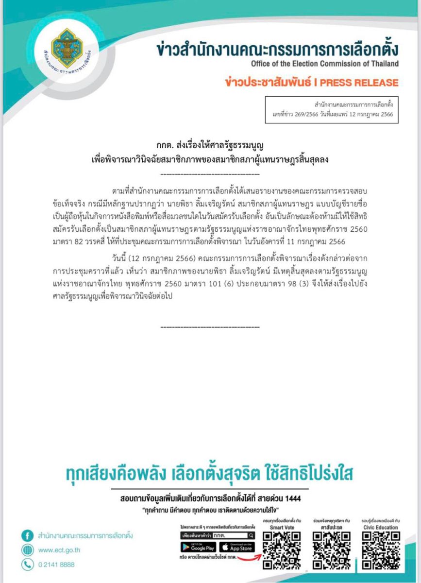 เมื่อวันที่ 12 กรกฎาคม 2566 สำนักงาน กกต.ได้เผยแพร่เอกสารข่าวระบุว่า ตามที่สำนักงาน กกต.ได้เสนอรายงานของคณะกรรมการตรวจสอบข้อเท็จจริงกรณีมีหลักฐานปรากฏว่า นายพิธา ลิ้มเจริญรัตน์ ส.ส.แบบบัญชีรายชื่อ เป็นผู้ถือหุ้นในกิจการหนังสือพิมพ์หรือสื่อมวลชนใดในวันสมัครรับเลือกตั้ง อันเป็นลักษณะต้องห้ามมิให้ใช้สิทธิ์สมัครรับเลือกตั้งเป็น ส.ส.ตามรัฐธรรมนูญ 2560 มาตรา 82 วรรคสี่ ให้ที่ประชุม กกต.พิจารณาในวันอังคารที่ 11 ก.ค.66 วันนี้ กกต.พิจารณาเรื่องดังกล่าวต่อจากการประชุมคราวที่แล้ว เห็นว่าสมาชิกภาพของ นายพิธา ลิ้มเจริญรัตน์ มีเหตุสิ้นสุดลงตามรัฐธรรมนูญ 2560 มาตรา 101 (6) ประกอบมาตรา 98 (3) จึงให้ส่งเรื่องไปยังศาลรัฐธรรมนูญเพื่อพิจารณาวินิจฉัยต่อไป (ข่าวที่เกี่ยวข้อง : ด่วนที่สุด!!! กกต.เชือด'พิธา'แล้ว มีมติส่งศาลรธน.ฟันพ้นส.ส.เหตุถือหุ้นไอทีวี)