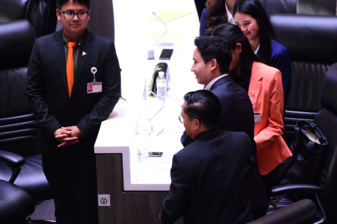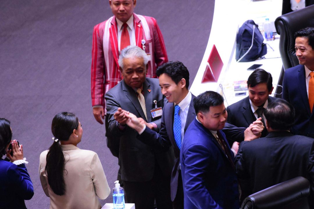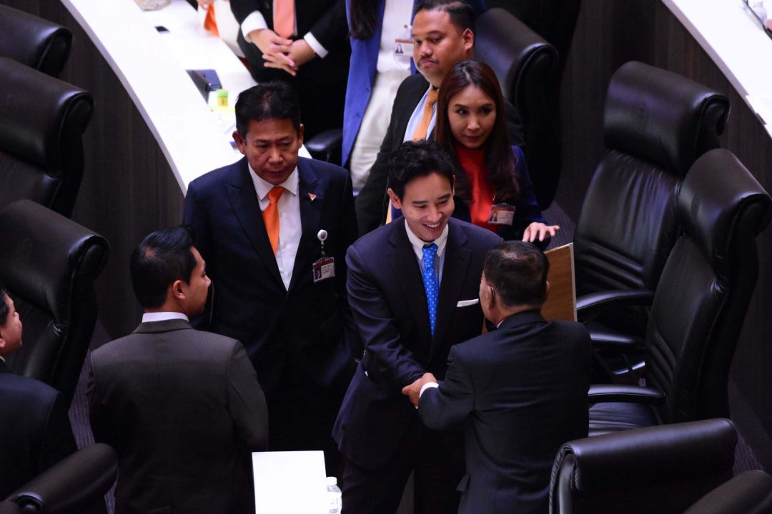 จากนั้น นายพิธา ได้ถอดบัตรประจำตัว ส.ส.ที่ติดไว้ที่หน้าอกออกยกขึ้นชู แล้ววางลงบนโต๊ะที่นั่ง ทำให้ ส.ส.ที่ส่วนใหญ่เป็นของพรรคก้าวไกล ลุกขึ้นยืนปรบมือให้ดังลั่นสภาฯ ขณะที่ นพ.ทศพร เสรีรักษ์ ส.ส.น่าน พรรคเพื่อไทย ก็ได้นำภาพวาดเหมือนนายพิธา เดินมามอบให้นายพิธา นอกจากนี้ นายพิธายังได้เดินไปจับมือกับ นายสมพงษ์ อมรวิวัฒน์ ส.ส.บัญชีรายชื่อ พรรคเพื่อไทย และนายสุชาติ ตันเจริญ ส.ส.บัญชีรายชื่อ พรรคเพื่อไทยด้วย ก่อนที่จะเดินออกจากห้องประชุม พร้อมชูกำปั้นแสดงสัญลักษณ์ถึงการต่อสู้