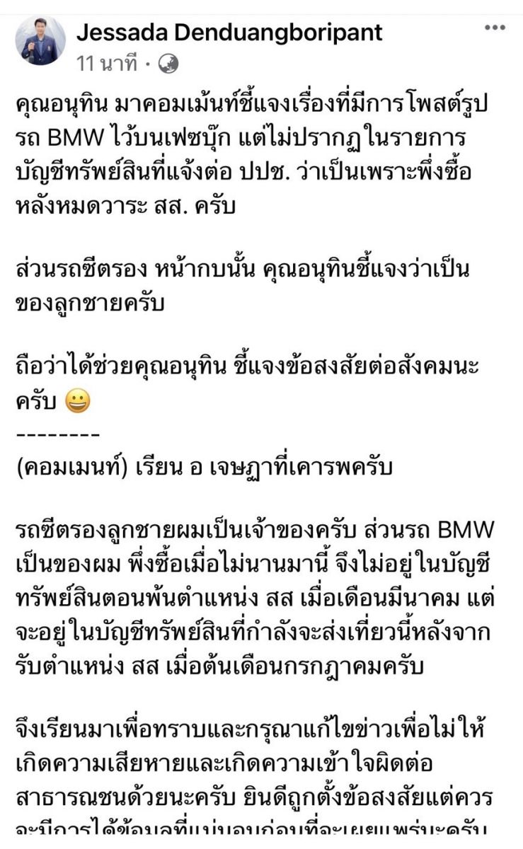 ส่วนรถ BMW เป็นของผม พึ่งซื้อเมื่อไม่นานมานี้ จึงไม่อยู่ในบัญชีทรัพย์สินตอนพ้นตำแหน่ง ส.ส. เมื่อเดือนมีนาคม แต่จะอยู่ในบัญชีทรัพย์สินที่กำลังจะส่งเที่ยวนี้หลังจากรับตำแหน่ง ส.ส เมื่อต้นเดือนกรกฎาคมครับ