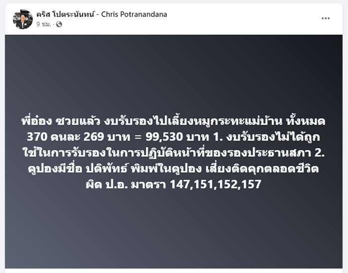 เมื่อวันที่ 20 สิงหาคม 2566 นายคริส โปตระนันทน์ หัวหน้าพรรคเส้นด้าย ผู้ร่วมก่อตั้งพรรคอนาคตใหม่ และอดีตสมาชิกพรรคก้าวไกล ได้โพสต์ข้อความลงบนเฟซบุ๊กส่วนตัว ระบุว่า "พี่อ๋อง ซวยแล้ว งบรับรองไปเลี้ยงหมูกระทะแม่บ้าน ทั้งหมด 370 คนละ 269 บาท = 99,530 บาท 1. งบรับรองไม่ได้ถูกใช้ในการรับรองในการปฏิบัติหน้าที่ของรองประธานสภา 2. คูปองมีชื่อ ปดิพัทธ์ พิมพ์ในคูปอง เสี่ยงติดคุกตลอดชีวิต ผิด ป.อ. มาตรา 147,151,152,157" จากกรณีที่ นายปดิพัทธ์ สันติภาดา รองประธานสภาคนที่ 1 ส.ส.พิษณุโลก พรรคก้าวไกล ใช้งบประมาณสำหรับเลี้ยงรับรอง เลี้ยงหมูกะทะแม่บ้านอาคารรัฐสภา จำนวน 370 คน เมื่อวันที่ 18 ส.ค.ที่ผ่านมา