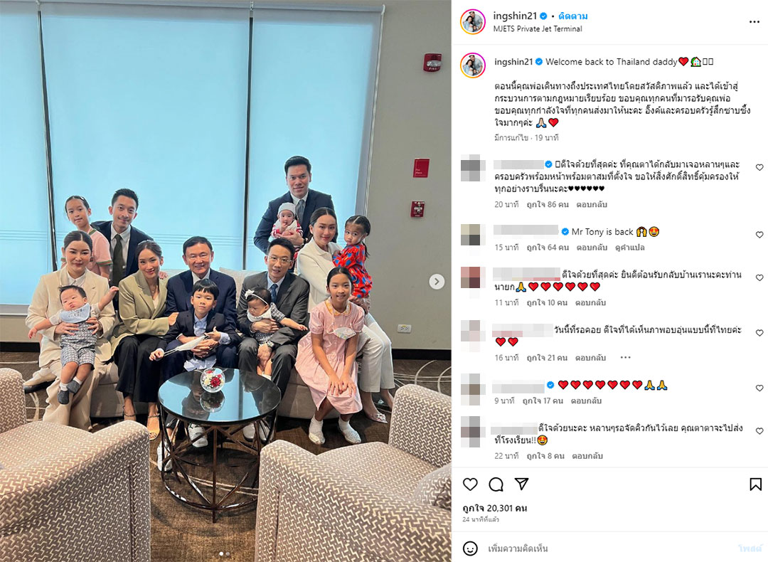 เมื่อวันที่ 22 สิงหาคม 2566 น.ส.แพทองธาร ชินวัตร หัวหน้าครอบครัวเพื่อไทย (พท.) และแคนดิเดตนายกฯรัฐมนตรีพรรคเพื่อไทย ได้โพสต์อินสตาแกรม ภาพแรกหลัง นายทักษิณ ชินวัตร ได้เดินทางกลับถึงไทย โดยมี "เอม" พินทองทา คุณากรวงศ์ และ "โอ๊ค" พานทองแท้ ชินวัตร พร้อมครอบครัวและหลานๆ ที่ไปรอรับที่สนามบินดอนเมือง โดยบรรยากาศเป็นไปอย่างอบอุ่น พร้อมข้อความระบุว่า "ตอนนี้คุณพ่อเดินทางถึงประเทศไทยโดยสวัสดิภาพแล้ว และได้เข้าสู่กระบวนการตามกฎหมายเรียบร้อย ขอบคุณทุกคนที่มารอรับคุณพ่อ ขอบคุณทุกกำลังใจที่ทุกคนส่งมาให้นะคะ อิ๊งค์และครอบครัวรู้สึกซาบซึ้งใจมากๆค่ะ"