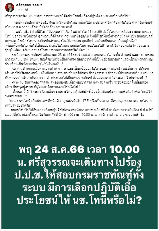 23 สิงหาคม 2566 นายศรีสุวรรณ จรรยา ผู้นำองค์กรรักชาติ รักแผ่นดิน โพสต์ข้อความในเฟซบุ๊ก ระบุว่า...