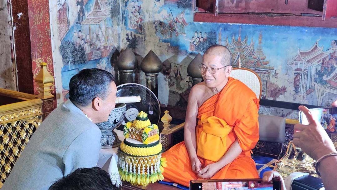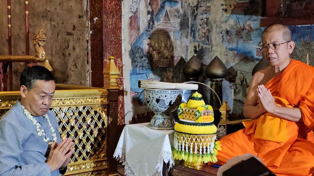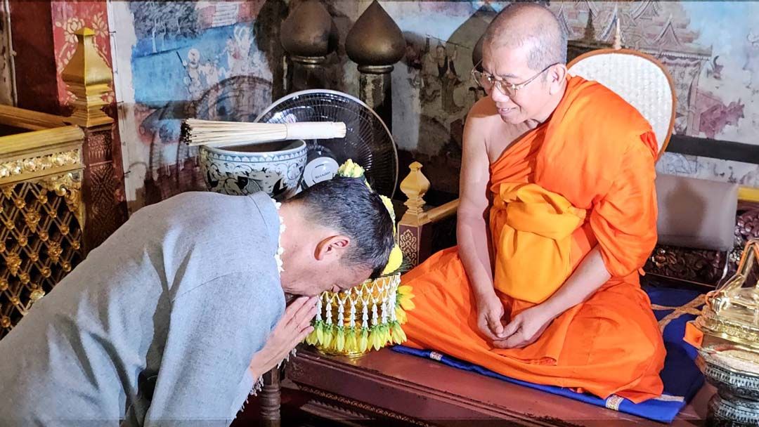 จากนั้นเจ้าอาวาสได้ประพรมน้ำพระพุทธน้ำมนต์และสวดชยันโตให้กับนายเศรษฐาเพื่อเป็นการให้ศีลและให้พร