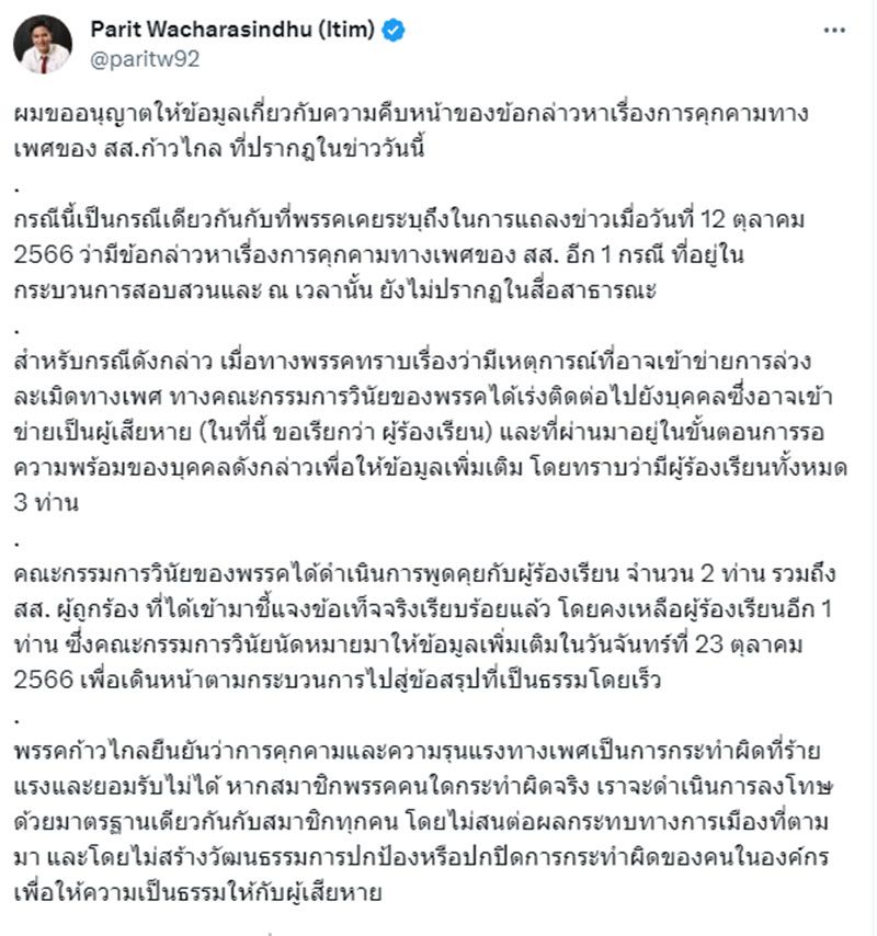 วันที่ 20 ตุลาคม 2566 นายพริษฐ์ วัชรสินธุ สส.บัญชีรายชื่อพรรคก้าวไกล ทวีตข้อความผ่าน x หรือทวิตเตอร์ ถึงกรณีสมาชิกพรรคก้าวไกลคุกคามทางเพศว่า ผมขออนุญาตให้ข้อมูลเกี่ยวกับความคืบหน้าของข้อกล่าวหาเรื่องการคุกคามทางเพศของ สส.ก้าวไกล ที่ปรากฎในข่าววันนี้ ว่า