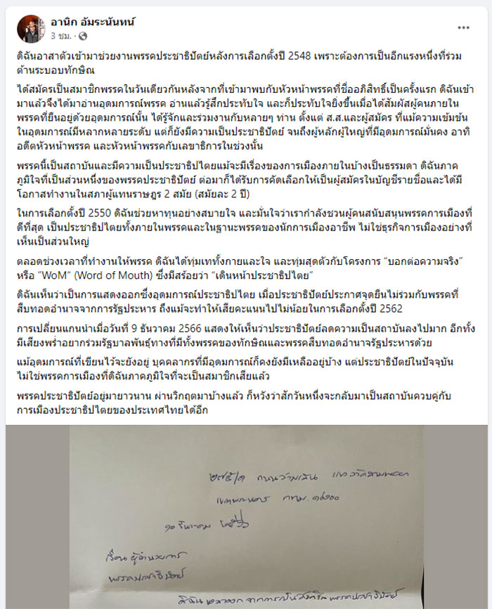 เมื่อวันที่ 12 ธันวาคม 2566 นางอานิก อัมระนันทน์ อดีต ส.ส.บัญชีรายชื่อ พรรคประชาธิปัตย์ (ปชป.) โพสต์ข้อความลงบนเฟซบุ๊กส่วนตัว ระบุว่า ดิฉันอาสาตัวเข้ามาช่วยงานพรรคประชาธิปัตย์หลังการเลือกตั้งปี 2548 เพราะต้องการเป็นอีกแรงหนึ่งที่ร่วมต้านระบอบทักษิณ