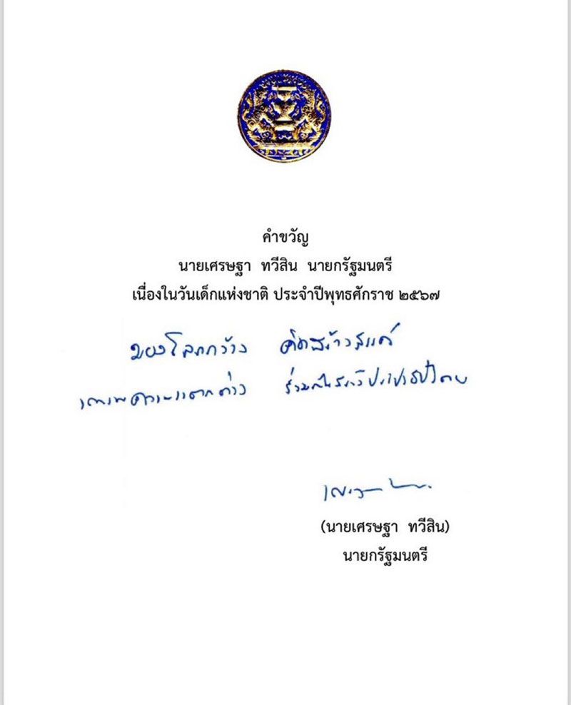 “นายกฯ“ เปิดคำขวัญวันเด็กปี67 “มองโลกกว้าง คิดสร้างสรรค์ เคารพความแตกต่าง ร่วมกันสร้างประชาธิปไตย”