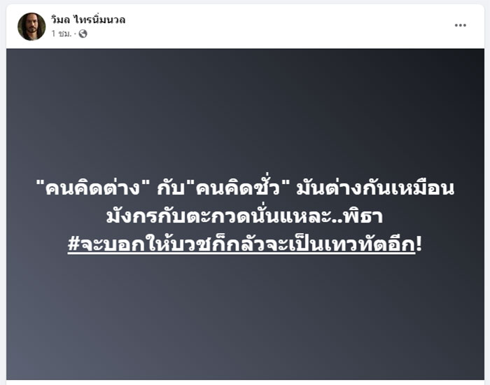 เมื่อวันที่ 11 กุมภาพันธ์ 2567 "วิมล ไทรนิ่มนวล" นักเขียนรางวัลซีไรต์ ได้โพสต์ข้อความลงบนเฟซบุ๊กส่วนตัว ระบุว่า "คนคิดต่าง"กับ"คนคิดชั่ว" มันต่างกันเหมือนมังกรกับตะกวดนั่นแหละ..พิธา #จะบอกให้บวชก็กลัวจะเป็นเทวทัตอีก!"