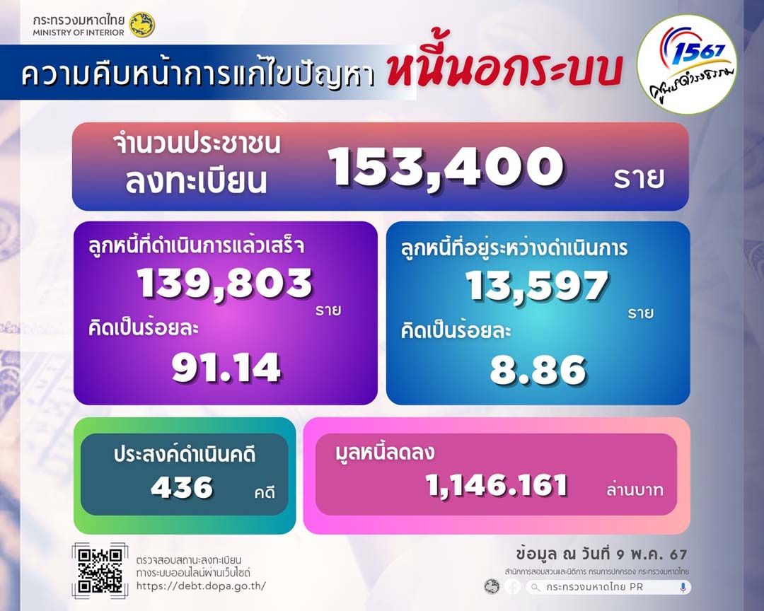 ปลัดมหาดไทย เผยความคืบหน้าการแก้ไขปัญหาหนี้นอกระบบ ดำเนินการแล้วเสร็จทั่วประเทศ 139,803 ราย มูลหนี้ลดลง 1,146.161 ล้านบาท กำชับทุกพื้นที่เร่งรัด ติดตามการแก้ไขปัญหาหนี้นอกระบบอย่างต่อเนื่อง พร้อมบูรณาการความร่วมมือจัดกิจกรรมส่งเสริมและพัฒนาคุณภาพชีวิตให้กับลูกหนี้นอกระบบ เพื่อขับเคลื่อนการแก้ไขปัญหาหนี้นอกระบบตามนโยบายรัฐบาลให้เกิดผลสำเร็จอย่างยั่งยืน