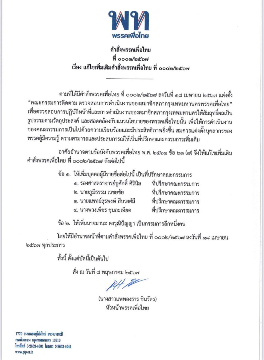 เมื่อวันที่ 15 พฤษภาคม 2567 น.ส.แพทองธาร ชินวัตร หัวหน้าพรรคเพื่อไทย (พท.) ลงนามในคำสั่งแก้ไขเพิ่มเติมคำสั่งพรรคเพื่อไทย ที่ 0002/2567 ว่า ตามที่ได้มีคำสั่งพรรคเพื่อไทยลงวันที่ 18 เม.ย.2567 แต่งตั้ง "คณะกรรมการติดตามตรวจสอบการดำเนินงานของสมาชิกสภากรุงเทพมหานครพรรคเพื่อไทย" เพื่อตรวจสอบการปฏิบัติหน้าที่ และการดำเนินงานของสมาชิกสภากรุงเทพมหานคร ให้สัมฤทธิ์ผล เป็นรูปธรรมตามวัตถุประสงค์ และสอดคล้องกับแนวนโยบายของพรรคเพื่อไทยนั้น