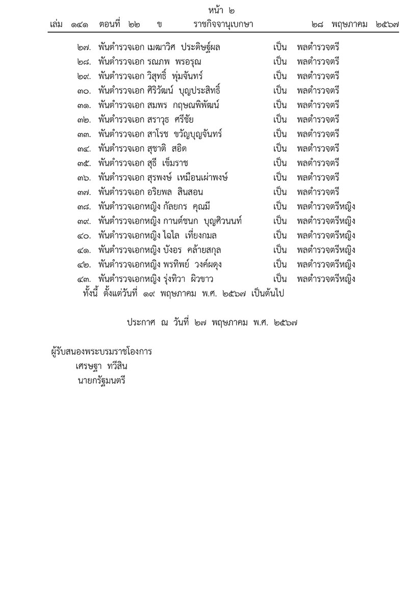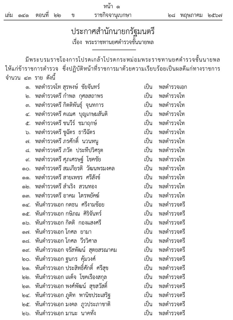 วันที่ 28 พฤษภาคม 2567 เว็บไซต์ราชกิจจานุเบกษา ได้เผยแพร่ประกาศสำนักนายกรัฐมนตรี เรื่อง พระราชทานยศตำรวจชั้นนายพล ความว่า มีพระบรมราชโอการโปรดเกล้าฯ พระราชทานยศตำรวจชั้นนายพล ให้แก่ข้าราชการตำรวจ ซึ่งปฏิบัติหน้าที่ราชการมาด้วยความเรียบร้อย เป็นผลดีแก่ทางราชการ จำนวน 43 ราย ดังนี้
