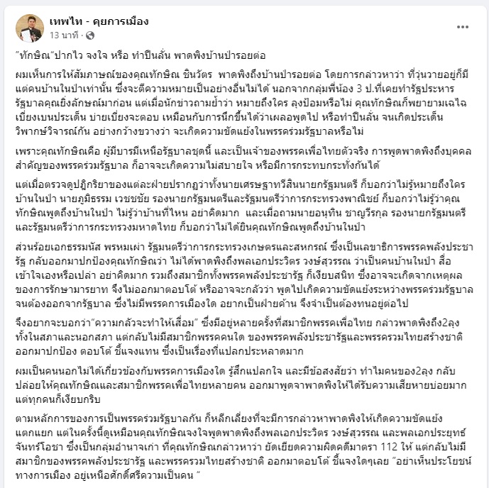 11 มิถุนายน 2567 นายเทพไท เสนพงศ์ อดีต สส.นครศรีธรรมราช พรรคประชาธิปัตย์ โพสต์เฟซบุ๊ก “เทพไท – คุยการเมือง” ในหัวข้อ “ทักษิณ ปากไว จงใจ หรือ ทำปืนลั่น พาดพิงบ้านป่ารอยต่อ” มีเนื้อหาดังนี้...