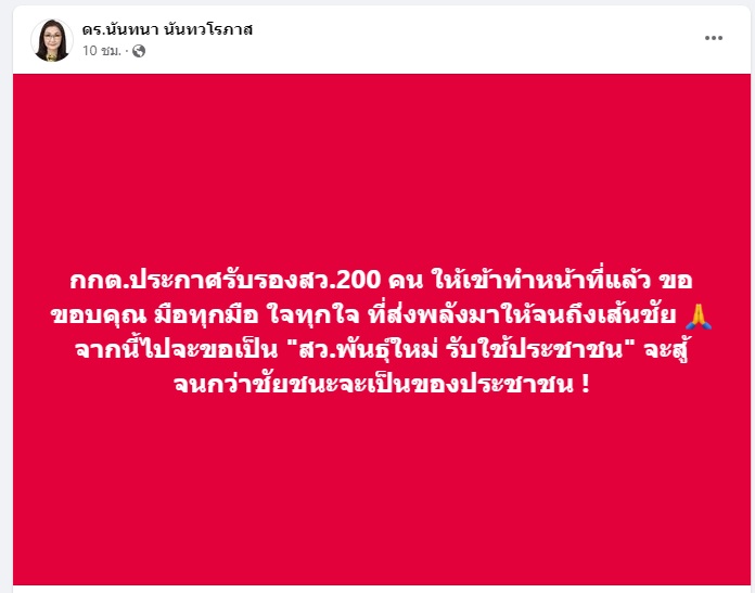 “กกต.ประกาศรับรองสว.200 คน ให้เข้าทำหน้าที่แล้ว ขอขอบคุณ มือทุกมือ ใจทุกใจ ที่ส่งพลังมาให้จนถึงเส้นชัย จากนี้ไปจะขอเป็น “สว.พันธุ์ใหม่ รับใช้ประชาชน” จะสู้จนกว่าชัยชนะจะเป็นของประชาชน !”