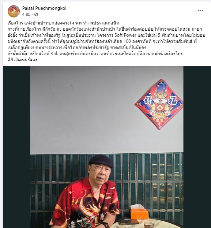 การที่ นายเรืองไกร ลีกิจวัฒนะ ยอดนักร้องแห่งสำนักบ้านป่า ได้ยื่นคำร้องต่อ ป.ป.ช. ให้ตรวจสอบไต่สวน นายกอุ๊งอิ๊งค์ ว่าเป็นเจ้าหน้าที่ของรัฐ ในฐานะเป็นประธาน โครงการ Soft Power และใช้เงิน 5 พันล้านบาทโดยไม่ชอบ ชนิดเอากันถึงตายครั้งนี้