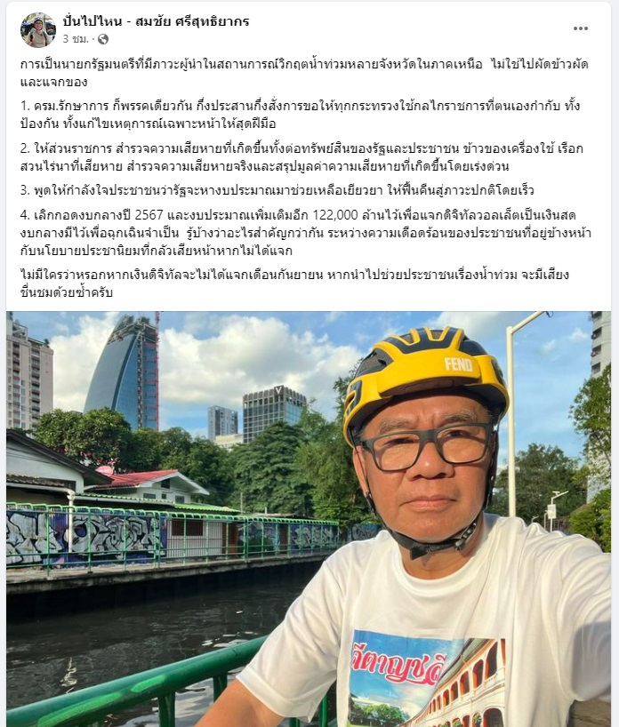 ภาวะผู้นำนายกฯ ‘น้ำท่วม’ไม่ใช่แค่ไปผัดข้าว ‘สมชัย’แนะเลิกกอดงบกลางแจก‘ดิจิทัลวอลเล็ต’หันมาช่วยผู้ประสบภัยก่อน