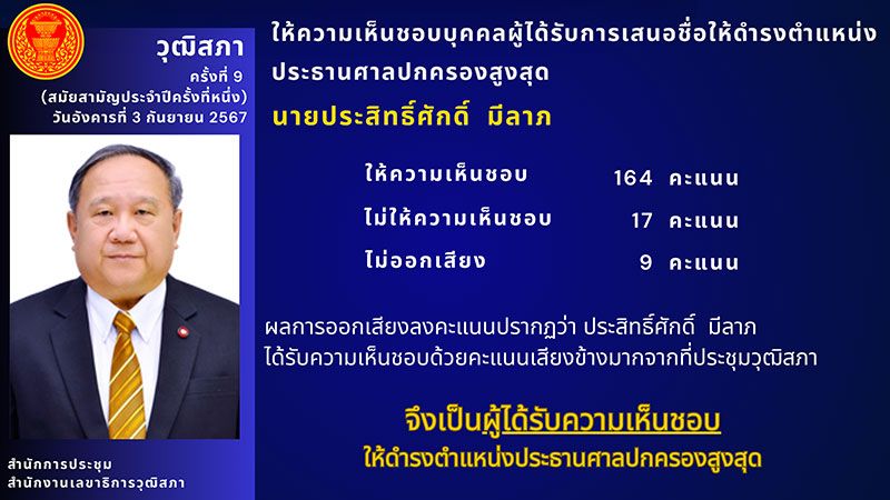วันที่ 3 กันยายน 2567 ที่รัฐสภา ผู้สื่อข่าวรายงานว่า ที่ประชุมวุฒิสภา (สว.) ลงคะแนนเสียงให้ความเห็นชอบ นายประสิทธิ์ศักดิ์ มีลาภ ผู้ได้รับการเสนอชื่อให้ดำรงตำแหน่งประธานศาลปกครองสูงสุด (ตามมาตรา 15/1 แห่ง พ.ร.บ.จัดตั้งศาลปกครองและวิธีพิจารณาคดีปกครอง พ.ศ. 2542 ซึ่งแก้ไขเพิ่มเติมโดย พ.ร.บ. จัดตั้งศาลปกครองและวิธีพิจารณาคดีปกครอง (ฉบับที่ 9) พ.ศ. 2560) ด้วยคะแนนเสียง ให้ความเห็นชอบ 164 คะแนน ไม่ให้ความเห็นชอบ 17 คะแนน ไม่ออกเสียง 9 คะแนนผลการออกเสียงลงคะแนนปรากฏว่า นายประสิทธิ์ศักดิ์ ได้รับความเห็นชอบด้วยคะแนนเสียงข้างมากจากที่ประชุม สว. จึงถือเป็นผู้ได้รับความเห็นชอบจากวุฒิสภาให้ดำรงตำแหน่งประธานศาลปกครองสูงสุด