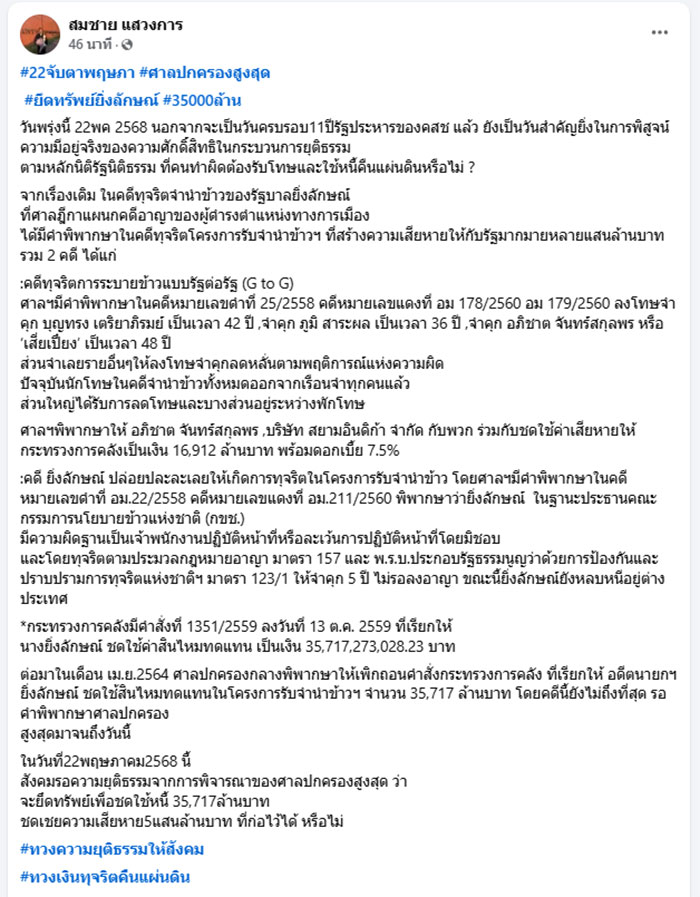เมื่อวันที่ 21 พฤษภาคม 2568 นายสมชาย แสวงการ อดีตสมาชิกวุฒิสภา (อดีต สว.) ได้โพสต์ข้อความลงบนเฟซบุ๊ก ระบุว่า #22จับตาพฤษภา #ศาลปกครองสูงสุด #ยึดทรัพย์ยิ่งลักษณ์ #35000ล้าน