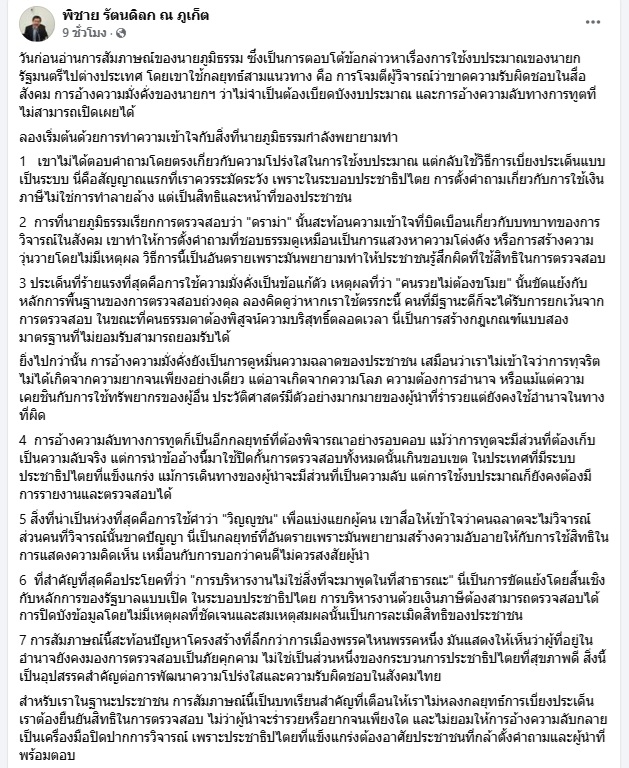 2.การที่นายภูมิธรรมเรียกการตรวจสอบว่า "ดราม่า" นั้นสะท้อนความเข้าใจที่บิดเบือนเกี่ยวกับบทบาทของการวิจารณ์ในสังคม เขาทำให้การตั้งคำถามที่ชอบธรรมดูเหมือนเป็นการแสวงหาความโด่งดัง หรือการสร้างความวุ่นวายโดยไม่มีเหตุผล วิธีการนี้เป็นอันตรายเพราะมันพยายามทำให้ประชาชนรู้สึกผิดที่ใช้สิทธิในการตรวจสอบ