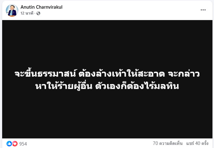 เมื่อวันที่ 5 มิถุนายน 2568 นายอนุทิน ชาญวีรกูล รองนายกรัฐมนตรี และรมว.มหาดไทย ในฐานะหัวหน้าพรรคภูมิใจไทย (ภท.) ได้โพสต์ลงบนเฟซบุ๊ก "Anutin Charnvirakul" ระบุว่า "จะขึ้นธรรมาสน์ ต้องล้างเท้าให้สะอาด จะกล่าวหาให้ร้ายผู้อื่น ตัวเองก็ต้องไร้มลทิน"