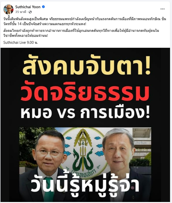 12 มิถุนายน 2568 นายสุทธิชัย หยุ่น สื่อมวลชนอาวุโส โพสต์เฟซบุ๊ก Suthichai Yoon ระบุว่า “วันนี้เดิมพันสังคมสูงเป็นพิเศษ จริยธรรมแพทย์กำลังเผชิญหน้ากับแรงกดดันการเมืองที่มีภาพหลอนทักษิณ ชินวัตรที่ชั้น 14 เป็นปัจจัยสร้างความแตกแยกทุกหัวระแหง!”