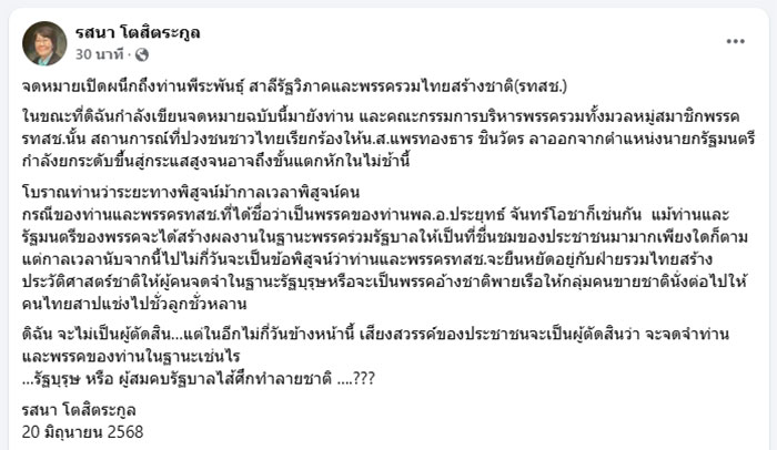 เมื่อวันที่ 20 มิถุนายน 2568 น.ส.รสนา โตสิตระกูล อดีตสมาชิกวุฒิสภา (สว.) ได้โพสต์ข้อความลงบนเฟซบุ๊ก ระบุว่า จดหมายเปิดผนึกถึงท่านพีระพันธุ์ สาลีรัฐวิภาค และพรรครวมไทยสร้างชาติ (รทสช.)