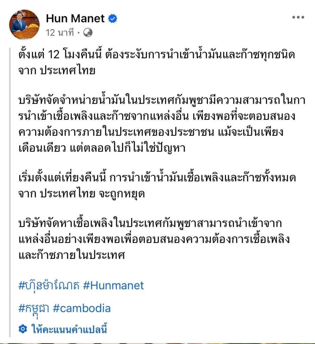 เมื่อวันที่ 22 มิ.ย.2568 นายกรัฐมนตรีกัมพูชา ฮุน มาเนต ได้ออกแถลงการณ์สำคัญผ่านช่องทางโซเชียลมีเดียส่วนตัว ประกาศระงับการนำเข้าน้ำมันเชื้อเพลิง และก๊าซทุกชนิดจากประเทศไทย โดยจะมีผลบังคับใช้ตั้งแต่เวลาเที่ยงคืนของวันนี้ (22 มิ.ย.2568) เป็นต้นไป