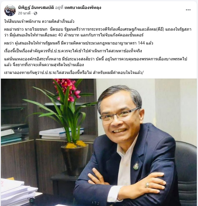 ผมอ่านข่าว นายไชยชนก ชิดชอบ รัฐมนตรีว่าการกระทรวงดิจิทัลเพื่อเศรษฐกิจและสังคม(ดีอี) แถลงในรัฐสภาว่า มีผู้เสนอเงินให้ท่านเดือนละ 40 ล้านบาท แลกกับการไม่จับแก๊งค์คอลเซ็นเตอร์