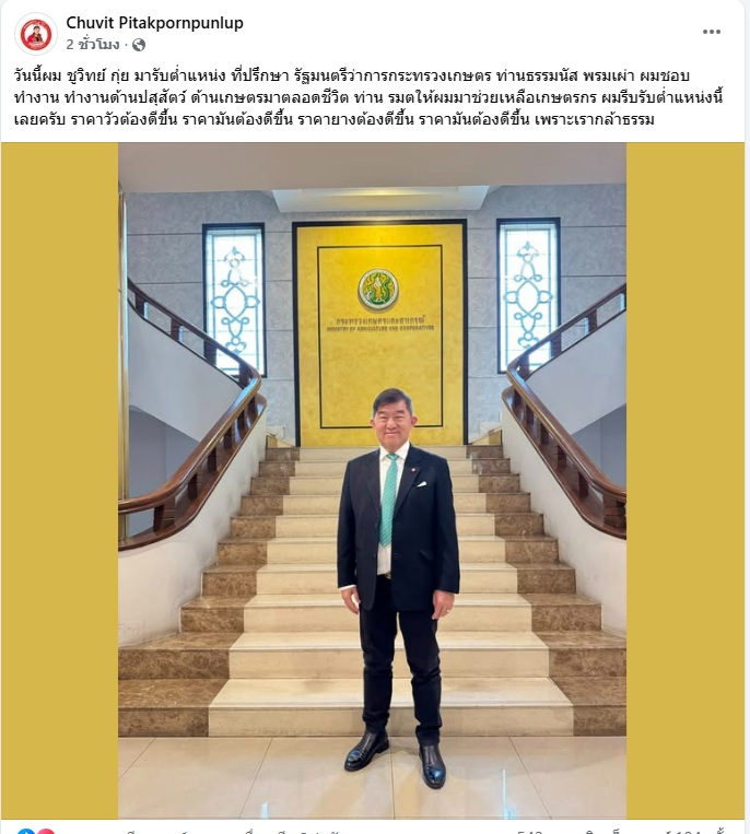 1 ตุลาคม 2568 นายชูวิทย์ พิทักษ์พรพัลลภ หรือ “ชูวิทย์ กุ่ย” อดีต สส.อุบลราชธานี ที่เพิ่งลาออกจากการเป็นสมาชิกพรรคเพื่อไทย เมื่อวันที่ 25 กันยายน 2568 โพสต์ภาพ พร้อมข้อความผ่านเฟซบุ๊ก ระบุว่า “วันนี้ผม ชูวิทย์ กุ่ย มารับตำแหน่ง ที่ปรึกษา รัฐมนตรีว่าการกระทรวงเกษตร ท่าน ธรรมนัส พรมเผ่า ผมชอบทำงาน ทำงานด้านปศุสัตว์ ด้านเกษตรมาตลอดชีวิต ท่าน รมต.ให้ผมมาช่วยเหลือเกษตรกร ผมรีบรับตำแหน่งนี้เลยครับ ราคาวัวต้องดีขึ้น ราคามันต้องดีขึ้น ราคายางต้องดีขึ้น ราคามันต้องดีขึ้น เพราะเรากล้าธรรม”