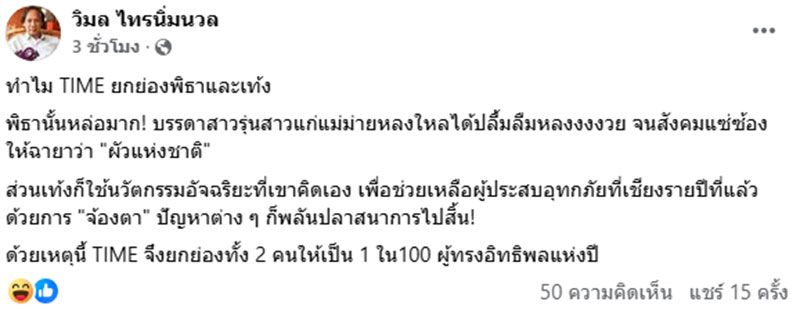 ล่าสุด วิมล ไทรนิ่มนวล นักเขียนรางวัลซีไรต์ โพสต์ข้อความผ่านเฟซบุ๊ก ถึงกรณีนี้ ระบุว่า ทำไม TIME ยกย่องพิธาและเท้ง