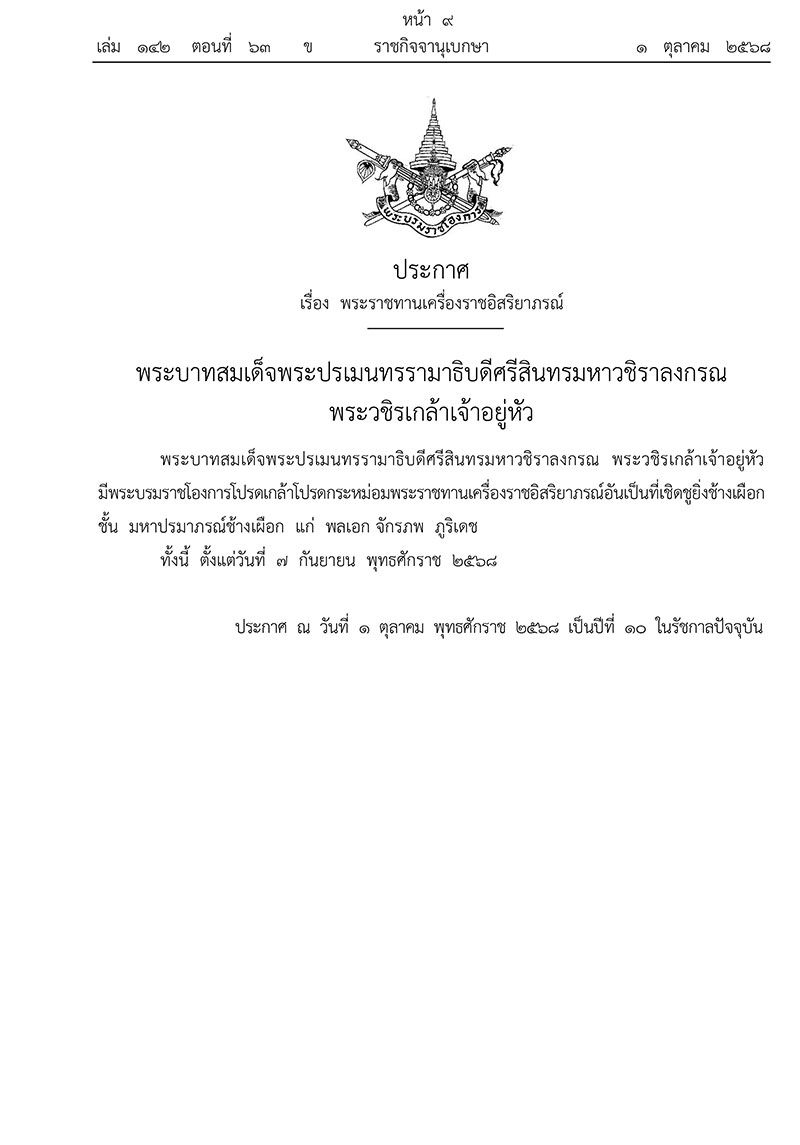 วันที่ 1 ตุลาคม 2568 เว็บไซต์ ราชกิจจานุเบกษา เผยแพร่ พระบรมราชโองการ ประกาศ เรื่อง พระราชทานเครื่องราชอิสริยาภรณ์ จำนวน 1 ราย