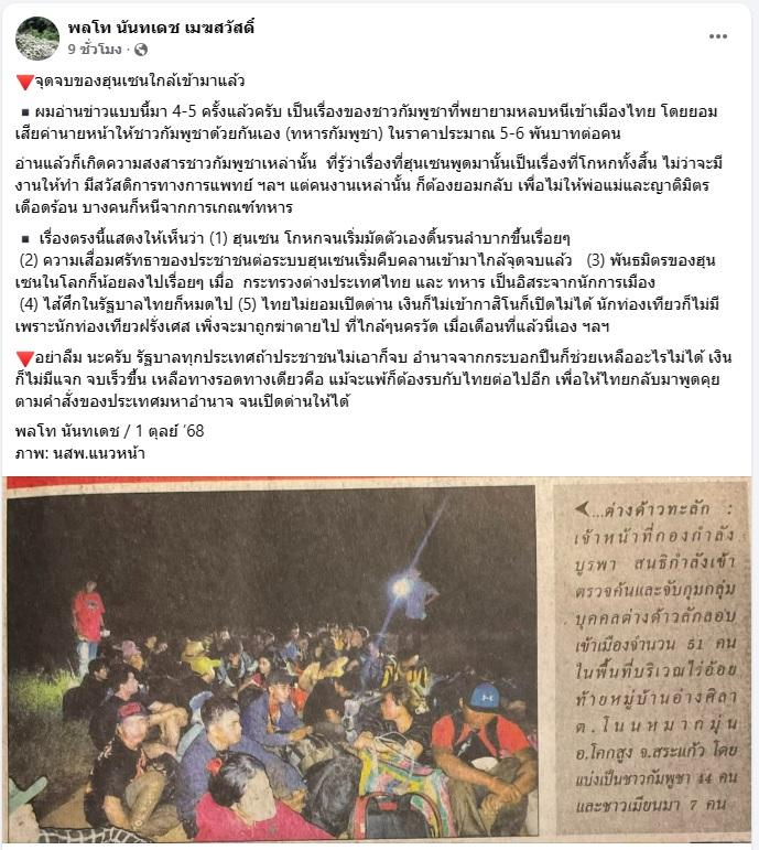 2 ตุลาคม 2568 พล.ท.นันทเดช เมฆสวัสดิ์ อดีตหัวหน้าศูนย์ปฏิบัติการพิเศษ ศูนย์รักษาความปลอดภัยแห่งชาติ (ศรภ.) โพสต์ภาพข่าวการจับกุมชาวกัมพูชาที่ลักลอบเข้าเมืองอย่างผิดกฎหมาย พร้อมข้อความผ่านเฟซบุ๊ก เรื่อง “จุดจบของฮุนเซนใกล้เข้ามาแล้ว” ระบุว่า...