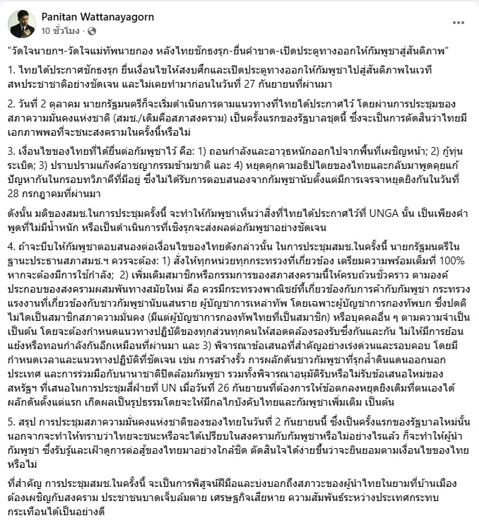 2 ตุลาคม 2568 รศ.ดร.ปณิธาน วัฒนายากร ผู้เชี่ยวชาญด้านความมั่นคงและต่างประเทศ โพสต์ข้อความผ่านเฟซบุ๊ก Panitan Wattanayagorn ดังนี้