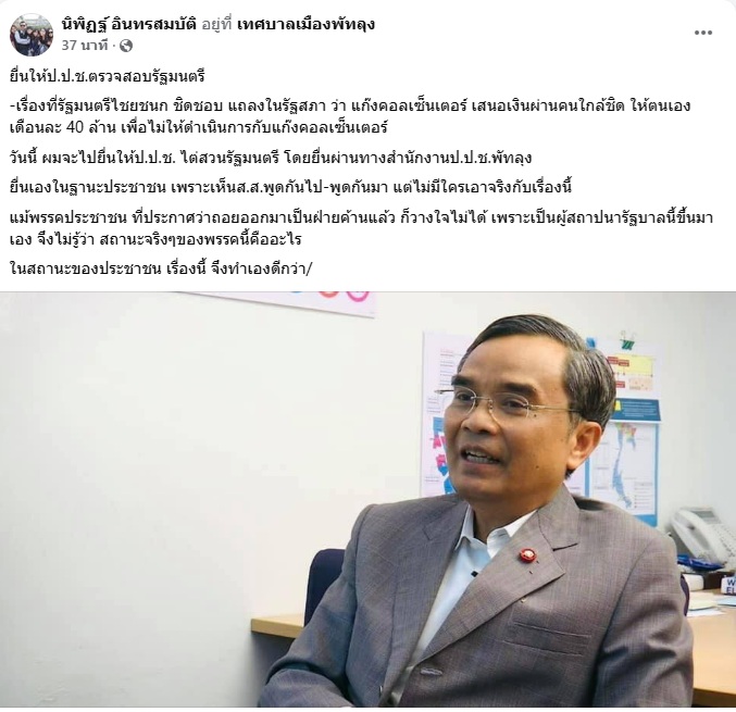 วันนี้ ผมจะไปยื่นให้ ป.ป.ช. ไต่สวนรัฐมนตรี โดยยื่นผ่านทางสำนักงานป.ป.ช.พัทลุง