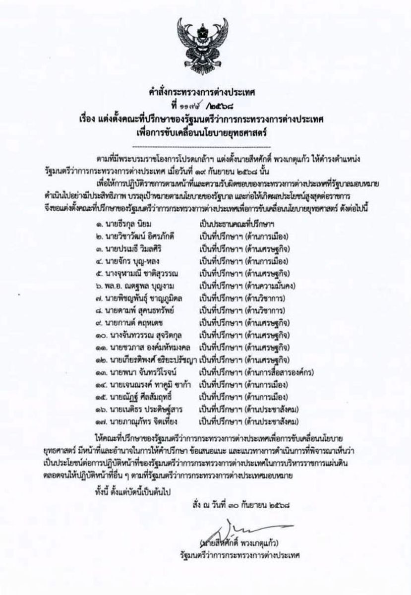รายงานข่าวแจ้งว่า เมื่อวันที่ 30 กันยายน 2568 นายสีหศักดิ์ พวงเกตุแก้ว รัฐมนตรีว่าการกระทรวงการต่างประเทศ ได้แต่งตั้งคณะที่ปรึกษาของรัฐมนตรีว่าการกระทรวงการต่างประเทศ เพื่อขับเคลื่อนนโยบายยุทธศาสตร์ จำนวน 17 คน โดยให้ นายธีรกุล นิยม เป็นประธานคณะที่ปรึกษาฯ