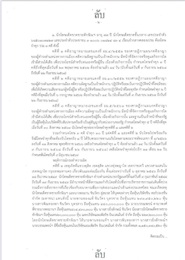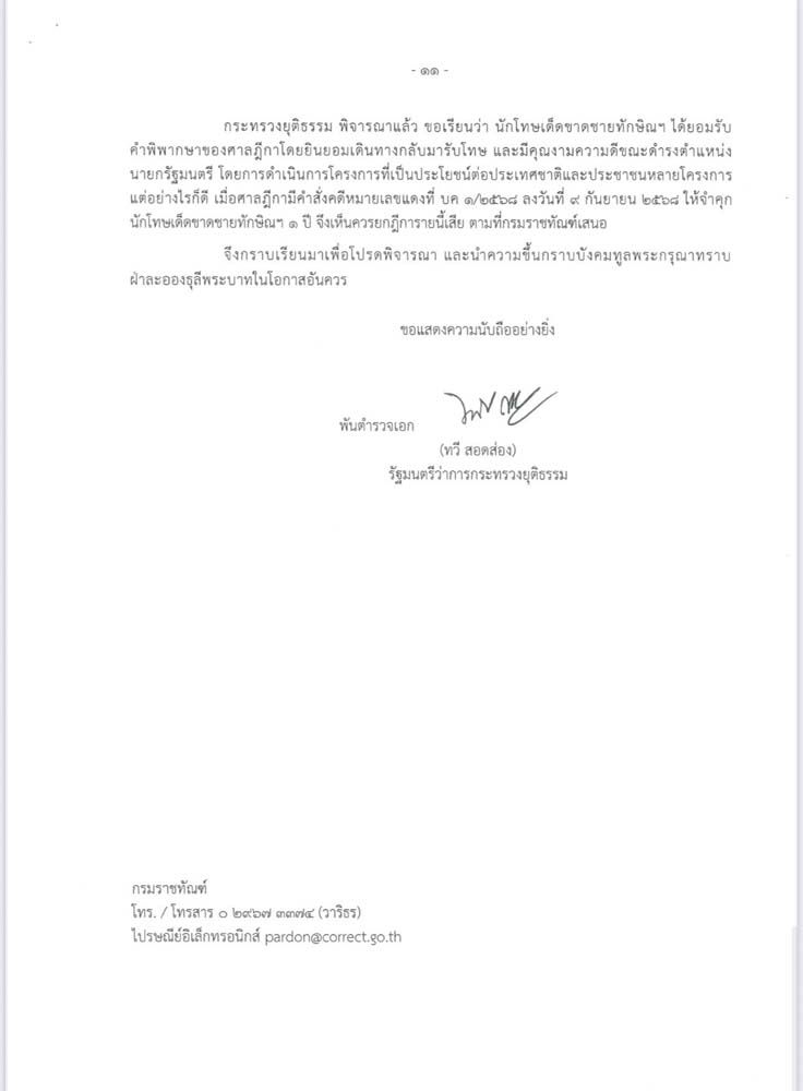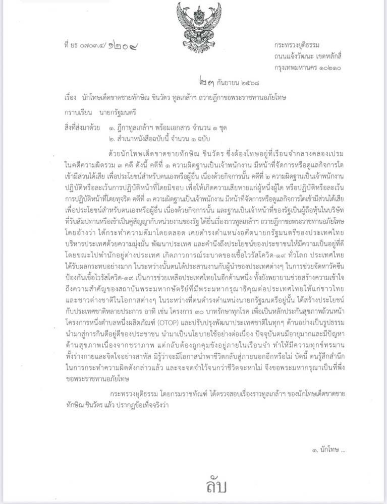 เมื่อวันที่ 2 ตุลาคม 2568 มีรายงานข่าวว่า เมื่อวันที่ 23 ก.ย.ที่ผ่านมา กระทรวงยุติธรรม โดย พ.ต.อ.ทวี สอดส่อง รมว.ยุติธรรม ได้ลงนามเอกสารลับที่ ยธ 0703.4/1204 เรื่อง นักโทษเด็ดขาดชายทักษิณ ชินวัตร ทูลเกล้าฯ ถวายฎีกาขอพระราชทานอภัยโทษ ถึงนายกรัฐมนตรี