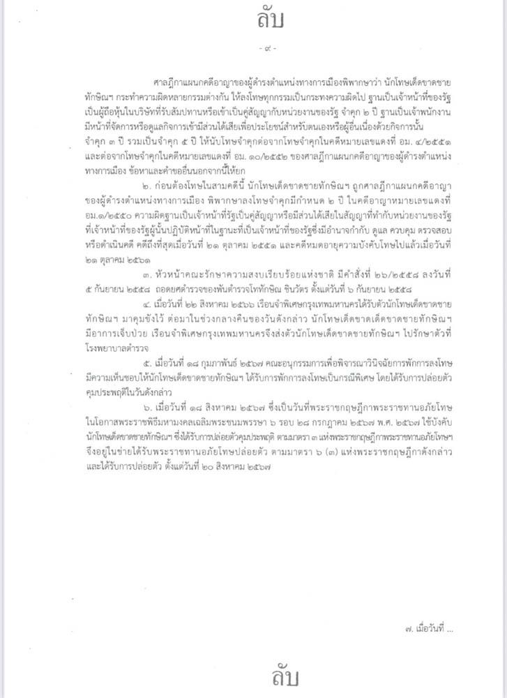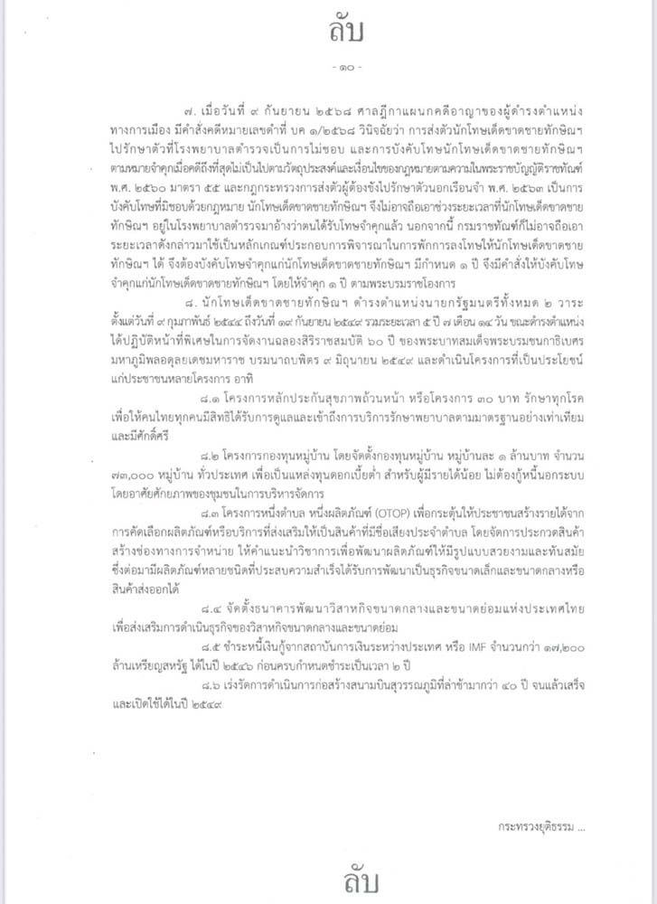 โดยสาระสำคัญคือ กระทรวงยุติธรรม พิจารณาแล้วขอเรียนว่า นักโทษเด็ดขาดชายทักษิณ ได้ยอมรับคำพิพากษาของศาลฎีกา โดยยินยอมเดินทางกลับมารับโทษ และมีคุณงามความดีขณะดำรงตำแหน่งนายกรัฐมนตรี โดยการดำเนินการโครงการที่เป็นประโยชน์ต่อประเทศชาติและประชาชนหลายโครงการ แต่อย่างไรก็ดี เมื่อศาลฎีกามีคำสั่งคดีหมายเลขแดงที่ บค 1/2568 ลงวันที่ 9 กันยายน 2568 ให้จำคุก นักโทษเด็ดขาดชายทักษิณ 1 ปี จึงเห็นควรยกฎีการายนี้เสีย ตามที่กรมราชทัณฑ์เสนอ จึงกราบเรียนมาเพื่อโปรดพิจารณา และนำความขึ้นกราบบังคมทูลพระกรุณาทราบฝ่าละอองธุลีพระบาทในโอกาสอันควร