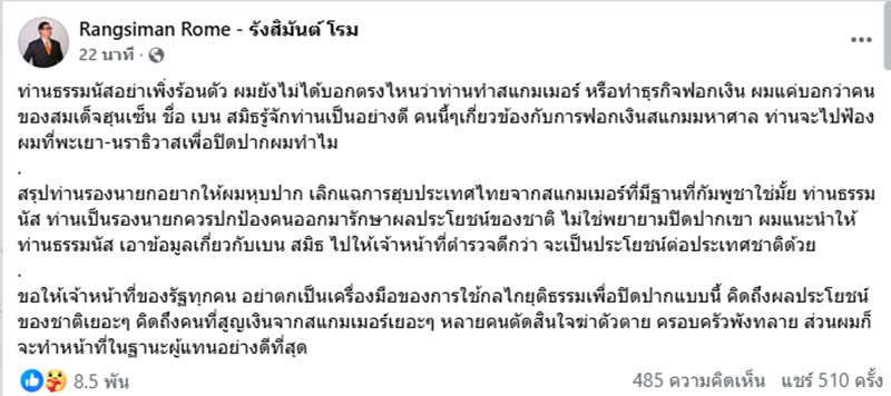 วันที่ 2 ตุลาคม 2568 จากรกณี ร.อ.ธรรมนัส พรหมเผ่า รองนายกรัฐมนตรี และรัฐมนตรีว่าการกระทรวงเกษตรและสหกรณ์ ให้สัมภาษณ์ถึงกรณีที่นายรังสิมันต์ โรม สส.บัญชีรายชื่อ พรรคประชาชนอภิปรายพาดพิงว่ามีความสัมพันธ์รู้จักกับ “เบน สมิธ” ที่อาจเป็นหัวขบวนของแก๊งสแกมเมอร์ว่า “ฟ้องแน่นอน” เวลานี้มีคดีอยู่ที่จังหวัดพะเยามากกว่า 270 คดี ซึ่งรวมถึงนักการเมืองด้วย สิ่งที่คุณพูดคุณเอาจากข่าว ซึ่งข่าวมาจากการทะเลาะระหว่างกลุ่มพลังงานด้วยกันเอง จึงขอตั้งคำถามว่าไปรับงานใครมาหรือไม่ เอาข่าวที่ชาวต่างชาติเขียน มาขยายความ ตนเองรู้ที่มาที่ไปทั้งหมด การนำภาพตนเองกับอดีตนายกรัฐมนตรีและชาวต่างชาติไปนั่งรับประทานอาหารร่วมกัน หรือเอารูปที่ตนเองทำบุญไปเผยแพร่ ก็แสดงว่าตนเองไปทำความดี ทำบุญก็เอามาลงเป็นตุเป็นตะ ที่บอกว่าตนเองมีรายได้จากธุรกิจสีเทา พูดผิดแล้ว เวลาทำงานกับตนเองก็ชื่นชม เวลาแบบนี้ก็นั่งเทียนเขียนข่าว ชีวิตตนเองมีอาชีพชัดเจน ก่อนมาทำอาชีพนักการเมืองก็เสียภาษีถูกต้อง รายได้ทุกบาททุกสตางค์ก็เสียภาษีหมด สำแดงได้หมด ดังนั้นอย่าเอามาพูดอีก เพราะตนเองจะไม่ฟ้องคดีอาญาอย่างเดียว แต่จะฟ้องร้องเรียกค่าเสียหายด้วย ทราบว่าผู้ประกอบการที่ได้รับผลกระทบก็จะฟ้องหลักพันล้านเช่นกัน ”ปากกล้าขาสั่น อย่ามาเล่นกับผม“