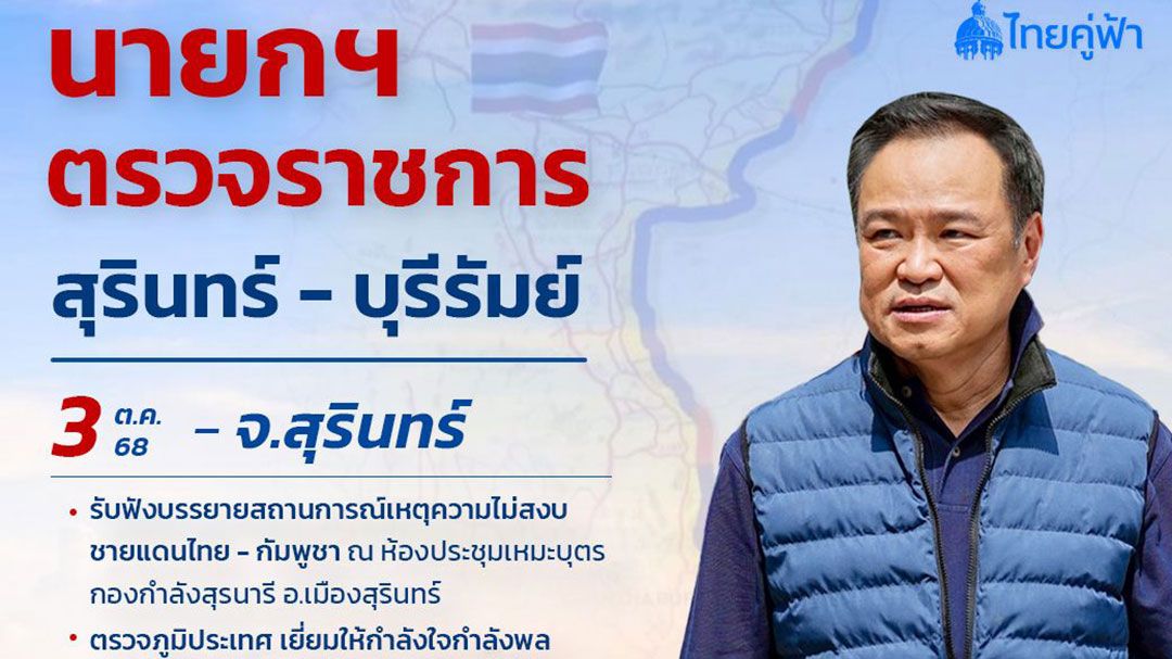 . รายงานข่าวจากทำเนียบรัฐบาลแจ้งว่านายอนุทิน ชาญวีรกูล นายกรัฐมนตรีและรมว.มหาดไทย พร้อมด้วย พล.อ.ณัฐพล นาคพาณิชย์ รมว.กลาโหม จะลงพื้นที่ตรวจราชการจังหวัดสุรินทร์ในวันพรุ่งนี้ (3 ตุลาคม) โดยมีแผนการรับฟังบรรยายเกี่ยวกับสถานการณ์เหตุความไม่สงบ ณ กองกำลังสุรนารี ก่อนจะเดินทางไปยังองค์การบริหารส่วนตำบลตาเมียง อ.พนมดงรัก เพื่อตรวจสอบภูมิประเทศและให้กำลังใจกำลังพลที่ฐานปฏิบัติการสามเหลี่ยม อ.พนมดงรักจ.สุรินทร์