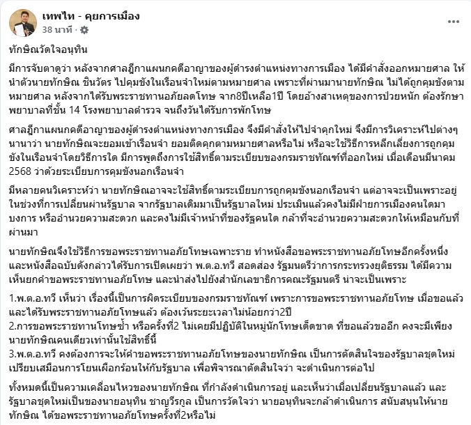 3 ตุลาคม 2568 นายเทพไท เสนพงศ์ อดีต สส.นครศรีธรรมราช โพสต์คลิป พร้อมข้อความผ่านเฟซบุ๊ก “เทพไท – คุยการเมือง” ในหัวข้อ “ทักษิณวัดใจอนุทิน” ระบุว่า...