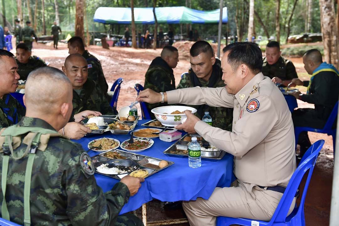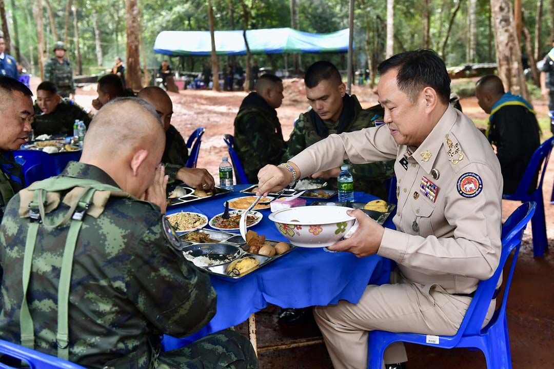 โดยบรรยากาศเป็นไปอย่างอบอุ่น นายกฯ ได้ร่วมรับประทานอาหารกลางวันกับกำลังพล เป็นอาหารถาดหลุม เมนูอาทิ ผัดมาม่า ยำปลากระป๋อง ไข่เจียว กล้วยน้ำว้า โดยนายกฯ ได้ตักไข่พะโล้ใส่จานให้กับนายทหารที่นั่งร่วมโต๊ะ พร้อมพูดคุยสอบถามถึงความเป็นอยู่และการปฏิบัติหน้าที่ด้วยความห่วงใย