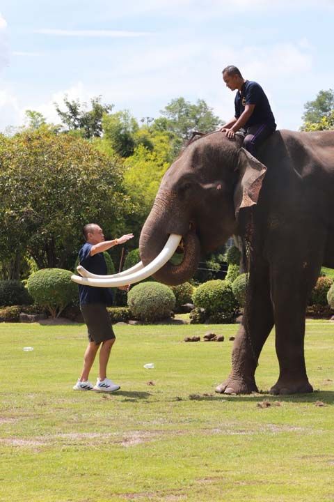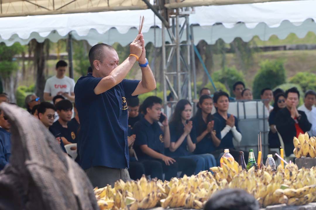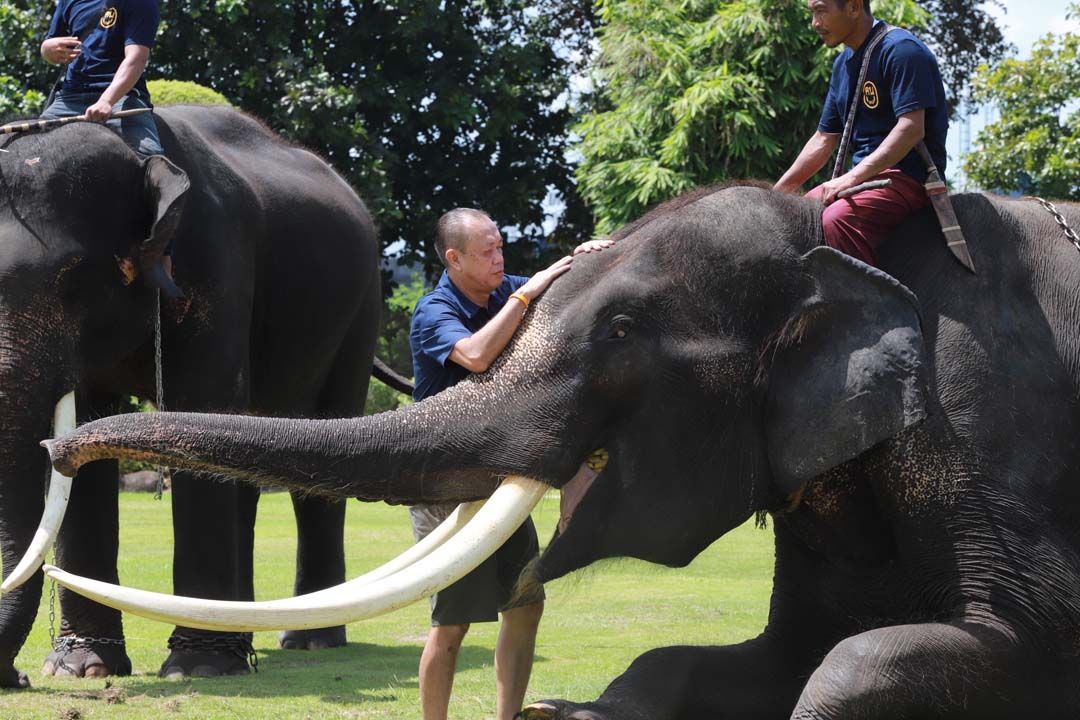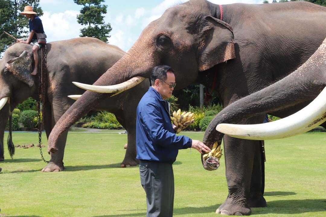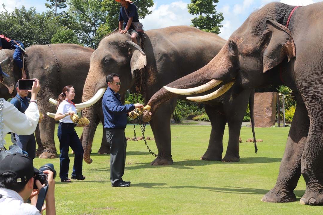 ต่อมาเวลา 10.50 น. นายอนุทิน ชาญวีรกูล นายกรัฐมนตรี และรมว.มหาดไทย ซึ่งเดินทางมาจากกรุงเทพมหานคร ถึงบริเวณสถานที่จัดงาน โดยทันทีที่พบกับนายเนวิน นายเนวินได้สวมกอดนายอนุทิน ก่อนจะเข้าสู่พิธีปะกำช้างจำนวน 10 เชือก ซึ่งเป็นพิธีที่ตระกูลชิดชอบสืบทอดมายาวนาน โดยมีคนในตระกูลชิดชอบ อย่างนายเนวิน พล.ต.อ.เพิ่มพูน นายศักดิ์สยาม ร่วมในพิธี หลังจากนั้นบรรดาผู้ร่วมงานได้นำกล้วยน้ำวามาป้อนช้าง เพื่อความเป็นสิริมงคล ตามความเชื่อ และได้มีพิธีผู้ข้อมือเรียกขวัญ เพื่อขอพรจากหมอช้าง