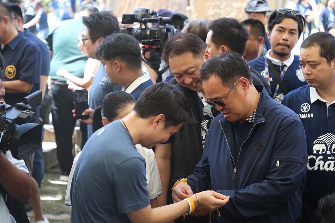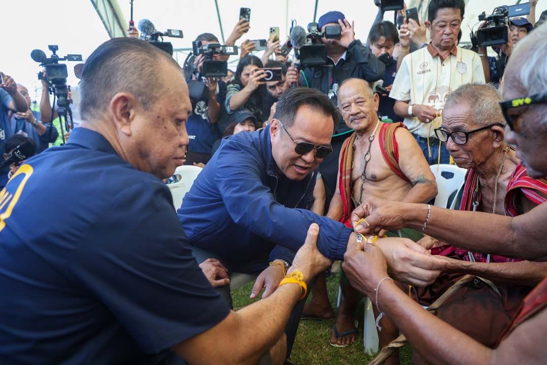นอกจากนี้ ได้มีพิธีผูกข้อมือเรียกขวัญ เพื่อขอพรจากหมอช้าง โดยหลังจากที่หมอช้าง ได้ผูกข้อมือให้นายเนวินแล้วเสร็จ นายเนวินได้กวักมือเรียกให้นายอนุทิน มาผูกข้อมือ เพื่อให้มาเป็นนายกฯ 4 ปี ทำให้นายอนุทิน หัวเราะออกมาเสียงดัง ก่อนที่ทั้งคู่จะโอบกอดกัน และนายอนุทินนั่งลงข้างๆนายเนวิน จากนั้นครูปะกำทั้ง 3 คน ได้เรียงกันผูกข้อมือนายอนุทิน ซึ่งระหว่างนั้นนายเนวินก็พูดอีกว่า "ผูกให้เป็นนายกฯ 4 ปี ให้ชนะเลือกตั้ง ทำอะไรก็ให้บ้านเมืองสงบสุข" โดยระหว่างที่มีการผูกข้อมือ พบว่านายเนวินประคองมือนายอนุทินให้หมอช้างผูกข้อมือตลอดเวลา