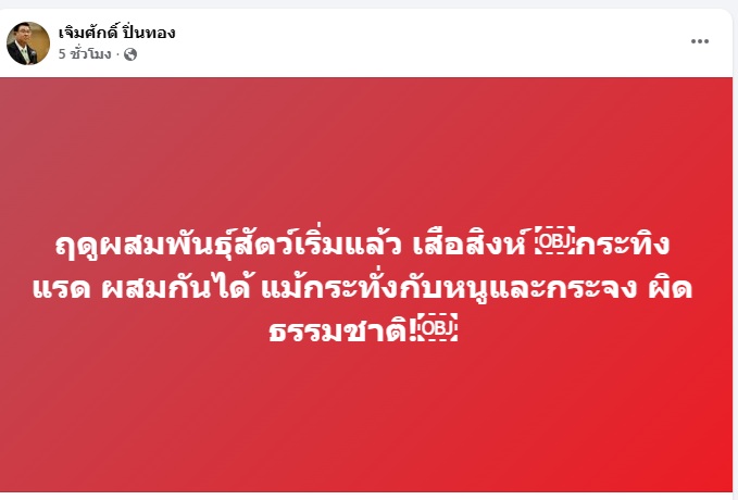 4 ตุลาคม 2568 รศ.ดร.เจิมศักดิ์ ปิ่นทอง นักวิชาการด้านเศรษฐศาสตร์ ได้โพสต์ข้อความลงบนเฟซบุ๊ก ระบุว่า “ฤดูผสมพันธุ์สัตว์เริ่มแล้ว เสือสิงห์ กระทิงแรด ผสมกันได้ แม้กระทั่งกับหนูและกระจง ผิดธรรมชาติ!”
