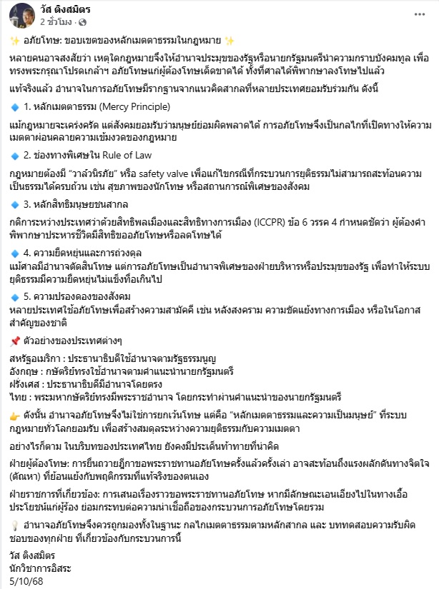 5 ตุลาคม 2568 นายวัส ติงสมิตร นักวิชาการอิสระ อดีตผู้พิพากษาอาวุโสในศาลฎีกา และอดีตประธานกรรมการสิทธิมนุษยชนแห่งชาติ (กสม.) โพสต์เฟซบุ๊กในหัวข้อ “อภัยโทษ: ขอบเขตของหลักเมตตาธรรมในกฎหมาย” ระบุว่า...